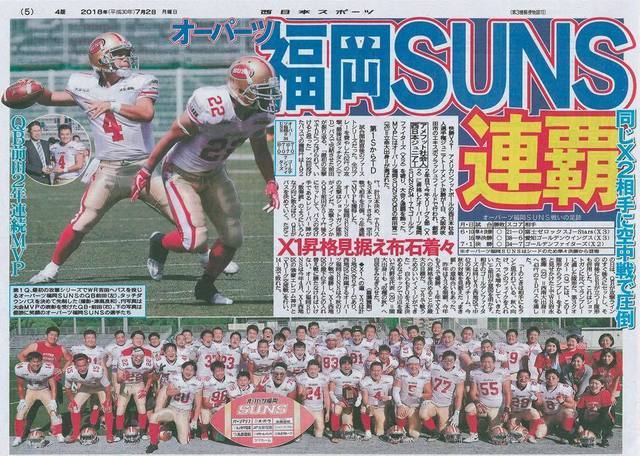 アメリカンフットボールの社会人チーム:オーパーツ福岡SUNSですが、7月1日(日)に行われたゴールデンファイターズとの決勝戦に無事勝利して、グリーンボウルJrトーナメント連覇を達成することができました。