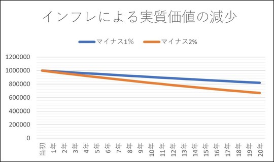 青色のラインは当初100万円の価値が毎年1%ずつ下がっていったケースです。10年後には約90万円、20年後には約81万円まで価値が下がることになります。