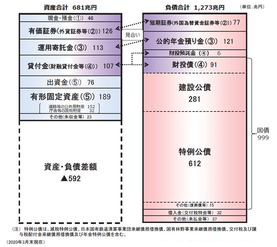こちらは2020年3月末時点の日本の貸借貸借表(バランスシート)です。