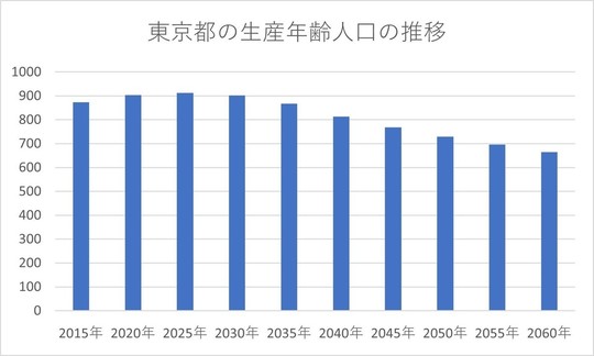 例えば東京都の場合、生産年齢人口は2020年の904万人から、2025年には913万人に増加する見通しになっています。(データ出所:「2060 年までの東京の人口推計」東京都政策企画局)