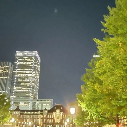 ふと私も振り返って東京駅を見てみると、ライトアップされた東京駅の上に皆既月食が・・・