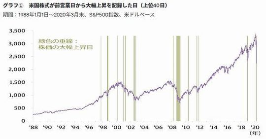 上記のグラフで分かるように、過去S&P500で大幅上昇が起きた日は、大幅下落の直後であることがほとんど。