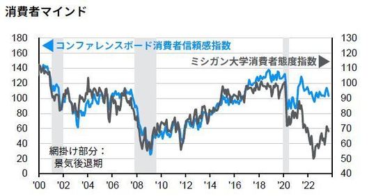 米国経済はGDPに占める個人消費の割合が高いという特徴がありますが、家計に余裕が無くなってきていることを踏まえれば、これから個人消費が徐々に落ちていく可能性は高く、また、足元の消費者マインドもけっして良好とはいえません。