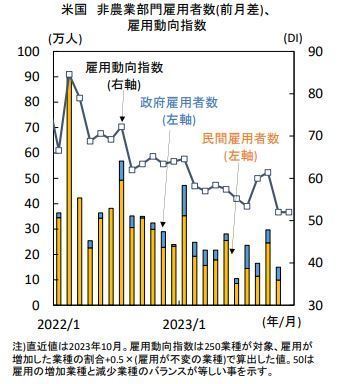 10月雇用統計の非農業部門雇用者数は前月差+15.0万人(前月:+29.7万人)と鈍化し、失業率は3.9%(同:3.8%)と上昇しました。