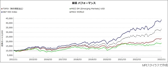 <日本・米国・世界株・新興国株式市場のパフォーマンス> 2013年12月~2023年11月