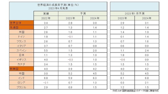 前回1月発表の見通しでは、欧州が暖冬などで景気後退を回避するとの期待、また、中国の経済再開やインフレ鈍化への期待などから上方修正が行われたことからすると、この3ヶ月の間に一気に悪い方向に変化したことになりますね。