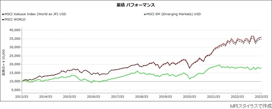 下記のグラフは先進国株式、新興国株式、全世界株式のパフォーマンスを比較したものですが、先進国株式指数(MSCI Kokusai Index)に占める米国株のウエイトは約7割と高いことから、先進国株式指数は新興国株式指数(MSCI Emerging Market Index)を大幅に上回るパフォーマンスでした。