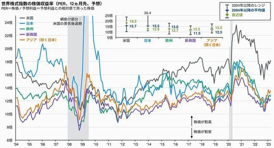 先進国株に注目が集まっていたこととは対照的に、割安で放置されてきたのが日本株と新興国株です。下記は株価の割高・割安を計る指標として最も使われることが多い株価収益率(PER)の推移です。