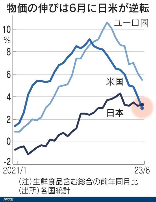 出所:日本経済新聞「日本の物価伸び率、米国を8年ぶり逆転 賃金上昇は鈍く」2023年7月21日