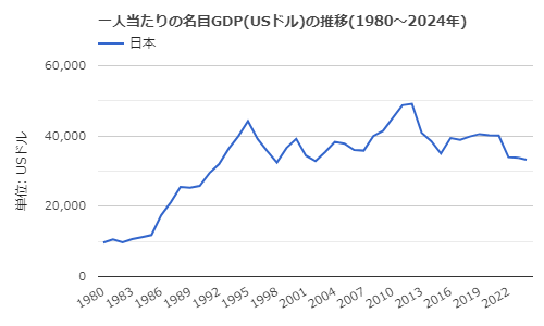 世界的に一人当たり名目GDPの推移は経済成長の度合いを測る上で重要な指標の一つと考えられていますが、日本の一人当たり名目GDPは伸び悩んでおり、2023年は約33805USドルで世界32位。現在33位の韓国にいつ抜かれてもおかしくない状況ですし、37位の台湾も右肩上がりで伸びています。日本の経済大国としての地位は年々落ちていっていて、「日本はもはや新興国」などと揶揄されても仕方がない状況です。
