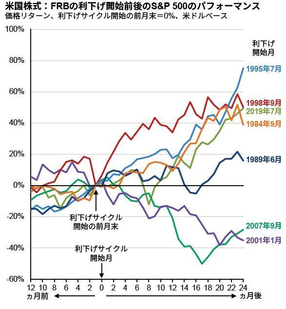 ■FRB利下げ開始後の株式市場のパフォーマンスはまちまちそこで今回は過去の利下げが行われた後のマーケット環境がどのようなものだったか。また、これから投資を行うにおいて、どのような点に注意をすればいいのかということを解説しようと思います。