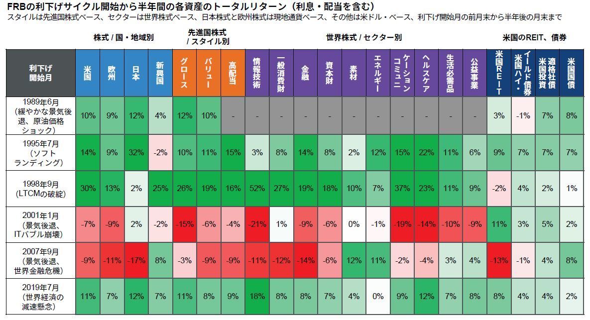 それではどのような資産がFRBの利下げ開始後に強かったのかを確認しましょう。下記の図表はFRB利下げ開始後、半年間の各資産のトータル・リターンを表しています。